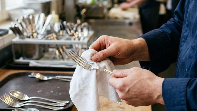 Cutlery should always be picked up by only the handles to avoid fingerprints and should be stacked neatly in the appropriate place.