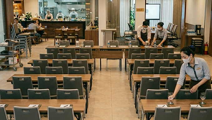 Set the meeting cover, you will need to check the BEO for the details of what you will need to set.